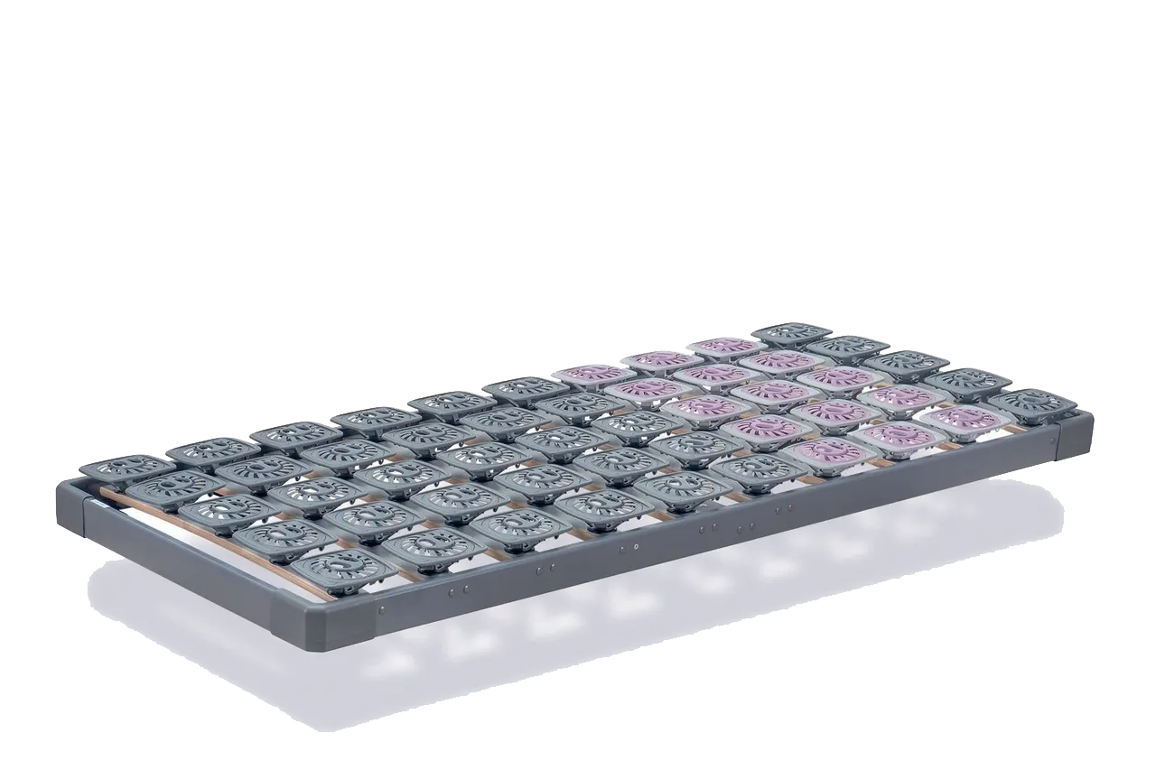 При помощи пульта управления регулируемые ортопедические основания можно установить в любое необходимое положение, в зависимости от ваших намерений. В исходном положении ортопедические основания для матрасов имеют целый ряд преимуществ перед обычными основаниями. Специальные пружинные элементы значительно улучшают вентиляцию матраса TEMPUR, при нагрузке они подстраиваются под матрас, помогая ему эффективнее решать стоящие перед ним задачи, а также значительно ослабляют и распределяют давление матраса на основания, распределяя его равномерно по всей площади основания FROLI. Это предотвращает деформацию матраса и создает идеальные условия для его эксплуатации. Они легко встраиваются в любую кровать абсолютно не меняя внешний вид.